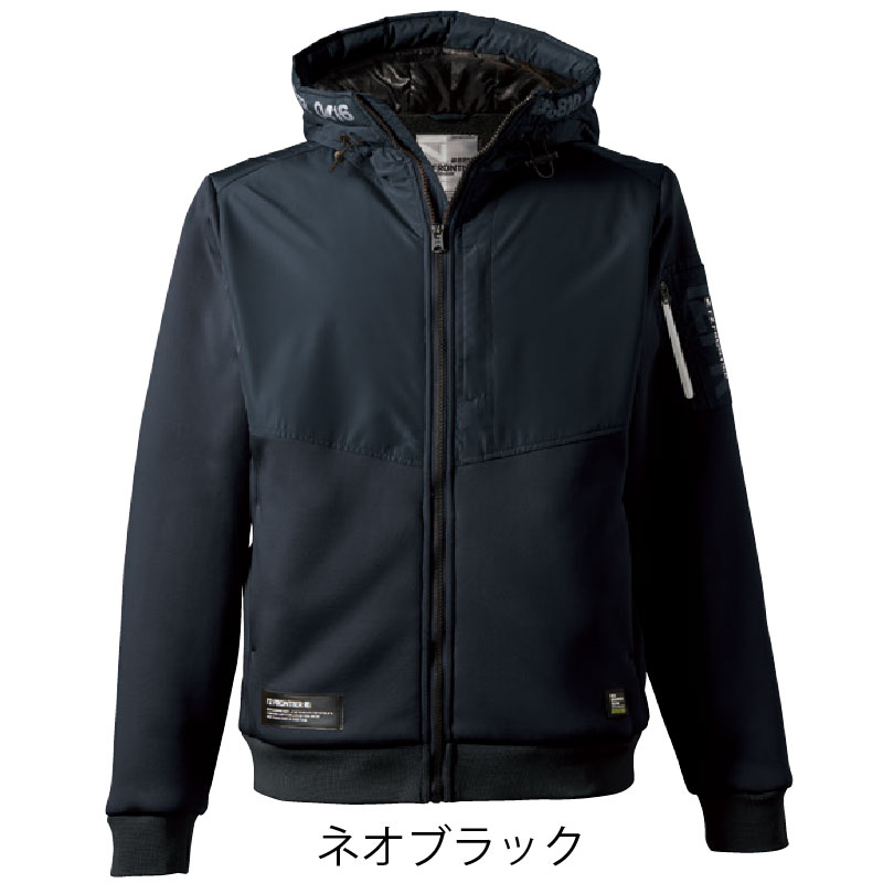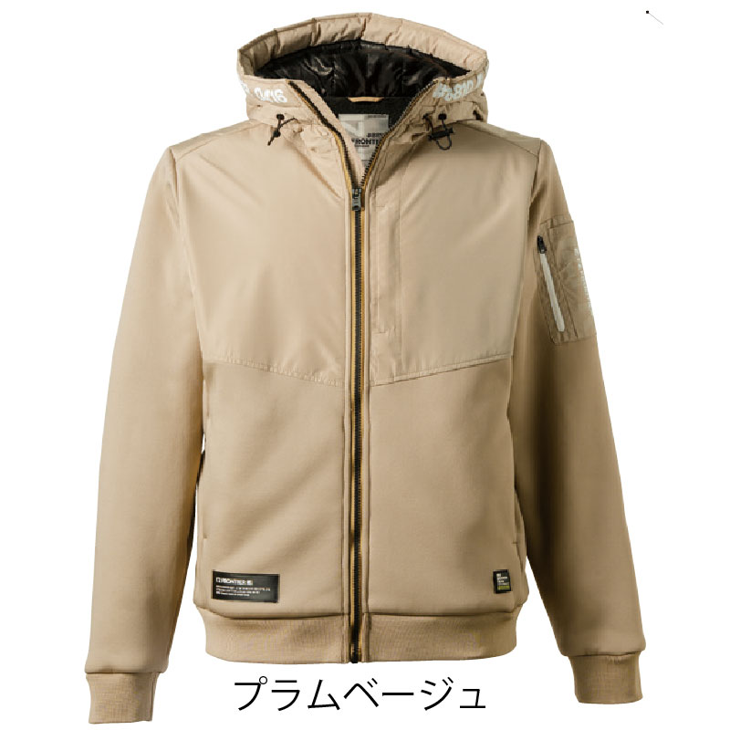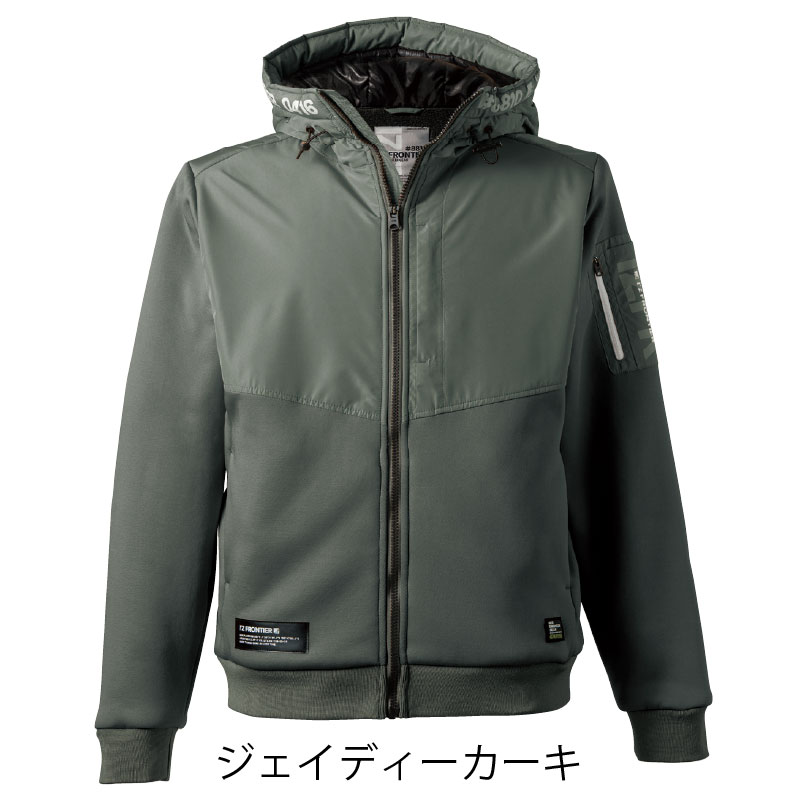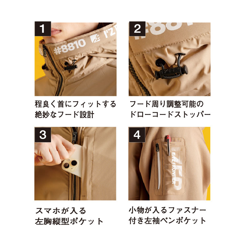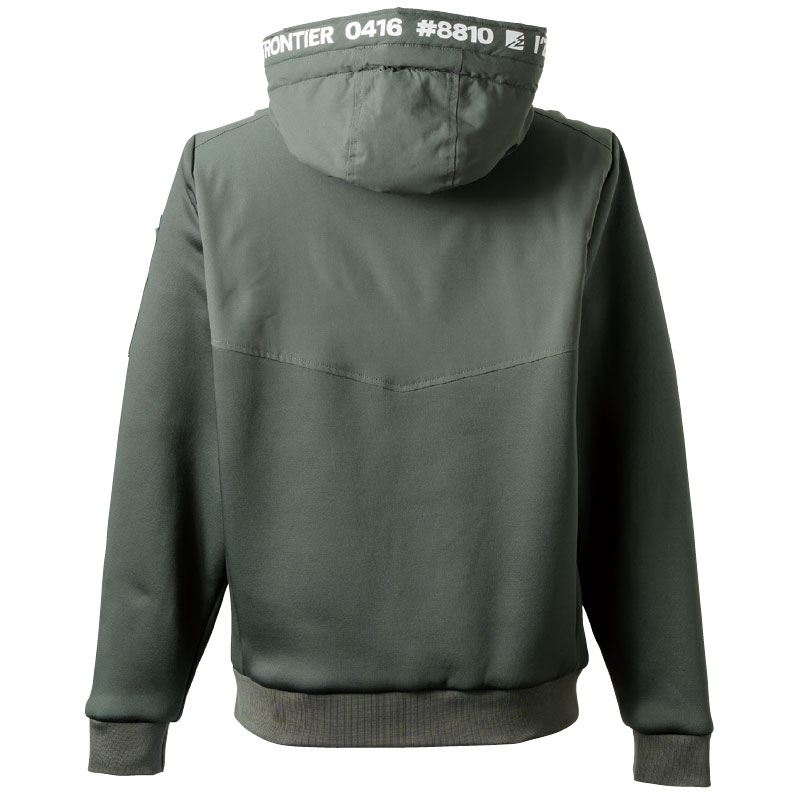 ▶フードや前身上部に防風性を兼ね備えた布帛素材を使用。このハイブリット構造により機能性と高級感をアップさせます。