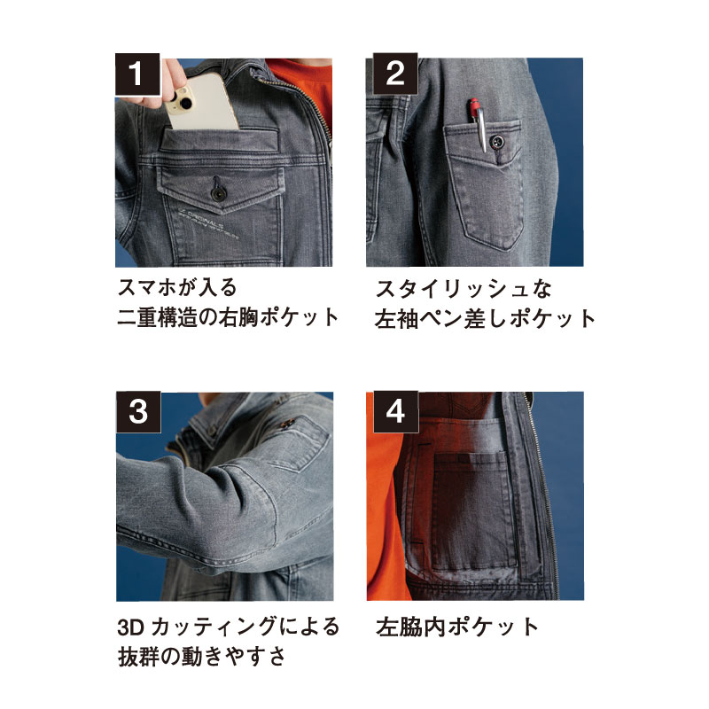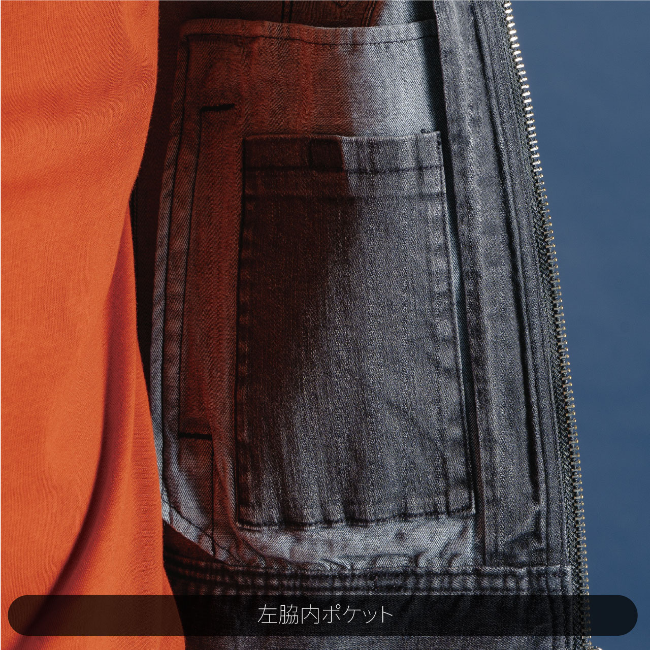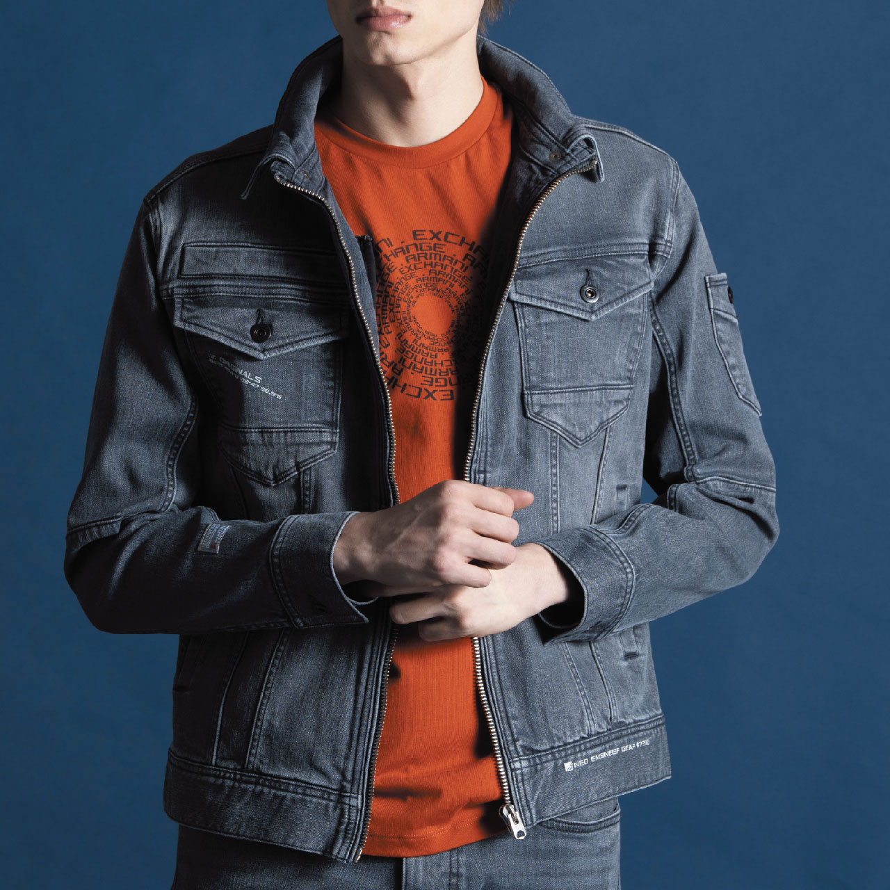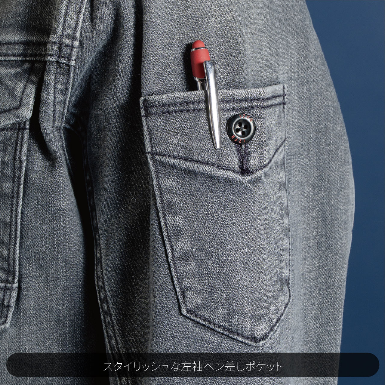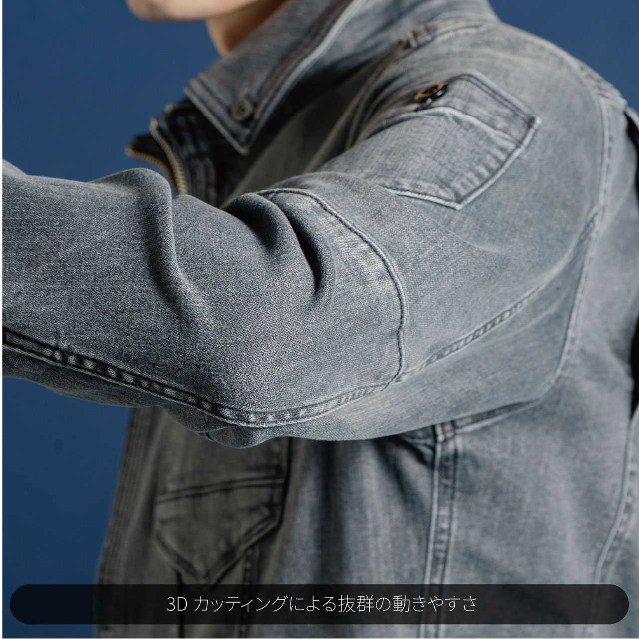 ▶現代におけるスタイリッシュを再定義し生み出された最新シルエットを誇るスト レッチデニムワークウェア。個人ユースのみならず、企業等のチームユニフォーム としてもその真価を遺憾なく発揮します。