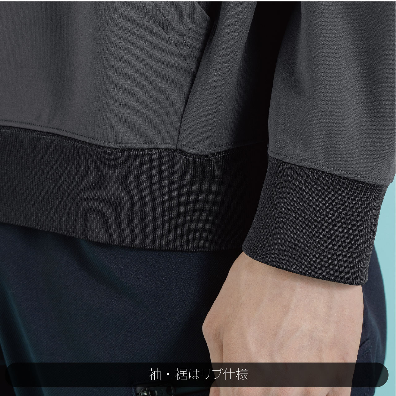 ▶複合繊維を採用し、伸長率ヨコ約40%、伸長回復率(1時間後) ヨコ約85%を測 定した適度な動き易さと、ポリウレタン糸使用素材では再現出来ない肘抜け感を 軽減したスタイリングを実現します。