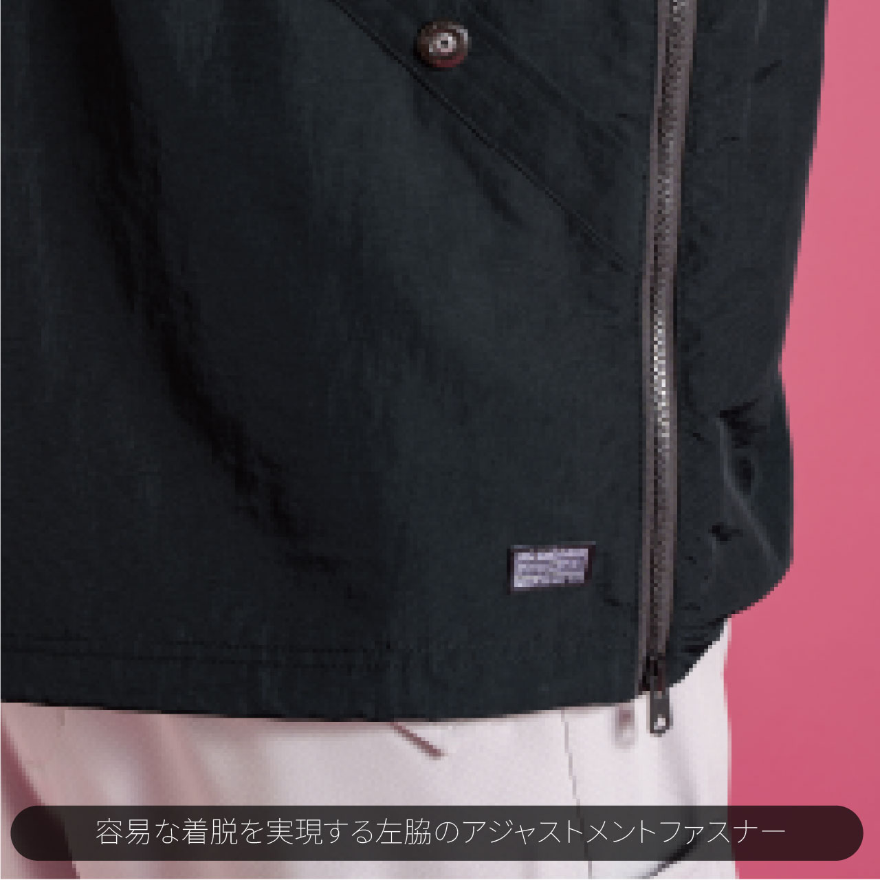 ▶商品裏側にダイヤメッシュ素材を採用。背面のベンチレーション仕様と左脇のア ジャストメントファスナー機能が快適な着用感を実現します。