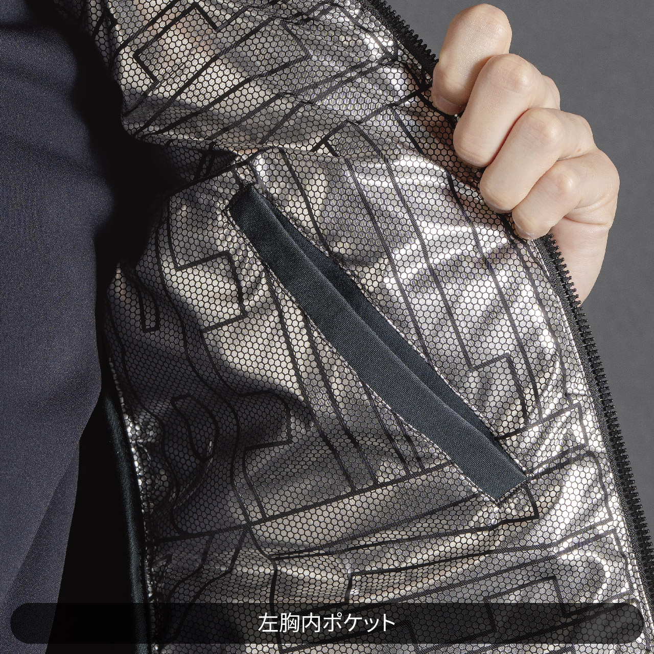 ▶裏地にはアルミプリントを施したタフタ素材を採用。反射熱効果で衣服内を温かく包み込みます。