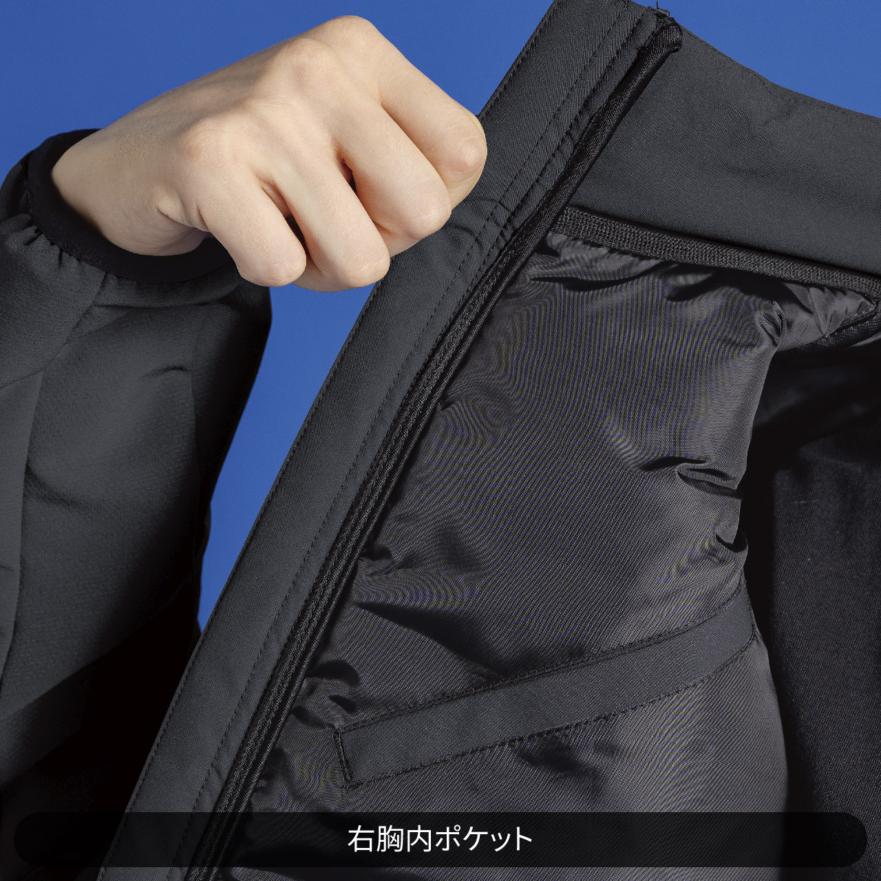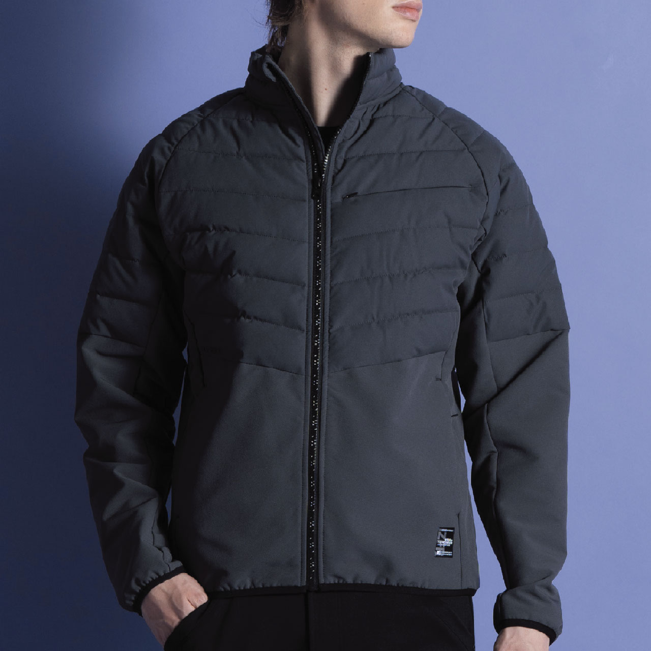 ▶キルティングパーツには表地、裏地共に適度なストレッチ性能を有した生地を使用し一定程度の動き易さを確保。中綿 には蓄熱性能に優れた高機能綿SORONA AURAを使用。羽毛のような軽さと暖かさに加え、伸縮性や弾力性を有し 型崩れも防ぎ水にも強いオールマイティーな高機能性を発揮。植物性由来樹脂を37%使用の環境にやさしいエコロ ジーな中綿です。