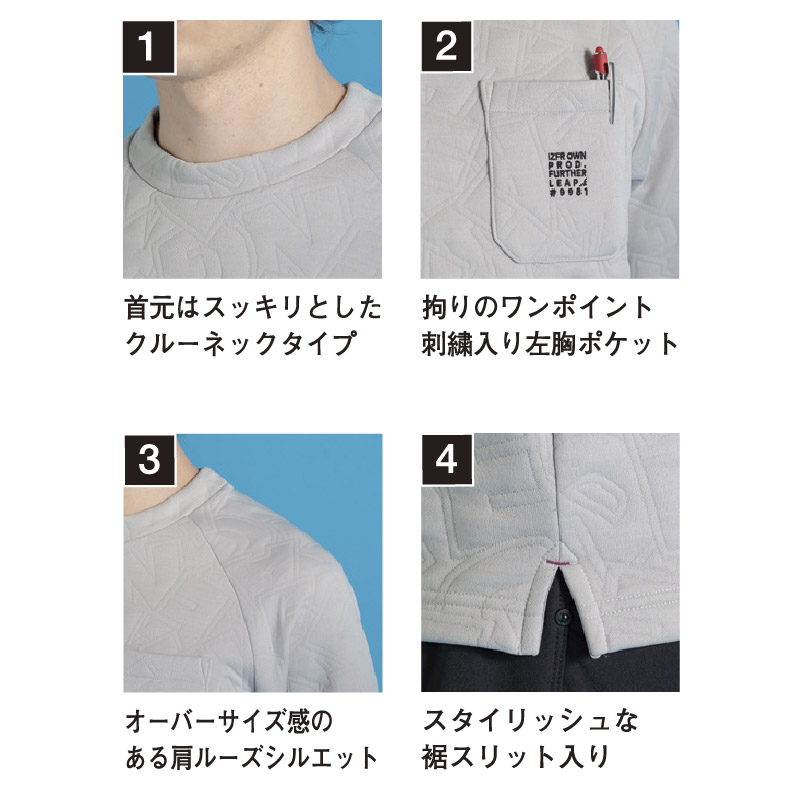 ▶胸ポケットはペンを挿せるやや大きめの設計も、タイポグラフィーなロゴ刺繍を施しデザイン性高いリッチなルックスを両立。